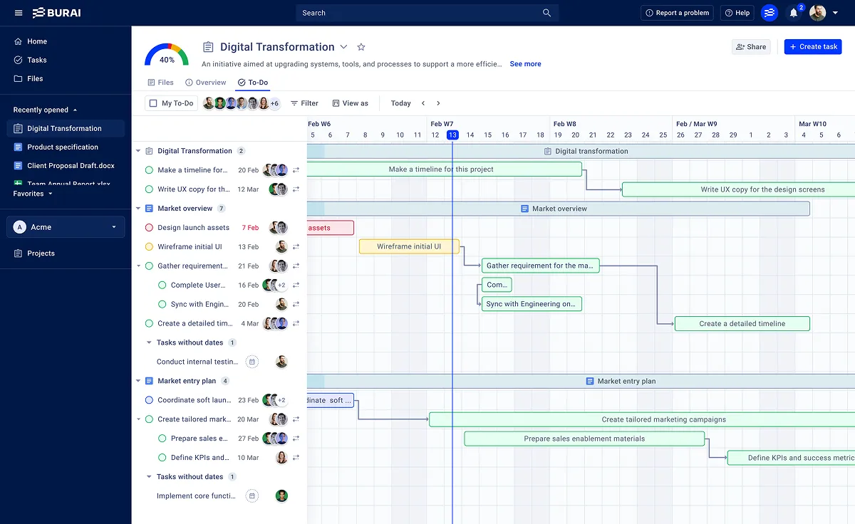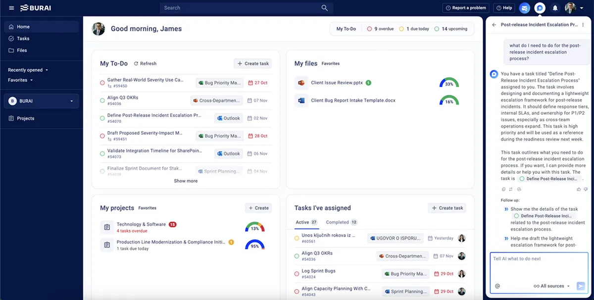 Burai CoPilot finds what you need the moment you need it—searching across tasks, documents, conversations, and collaborators instantly. It understands who you’re working with, what’s due, and where everything lives, cutting hours of digging through chats and files.