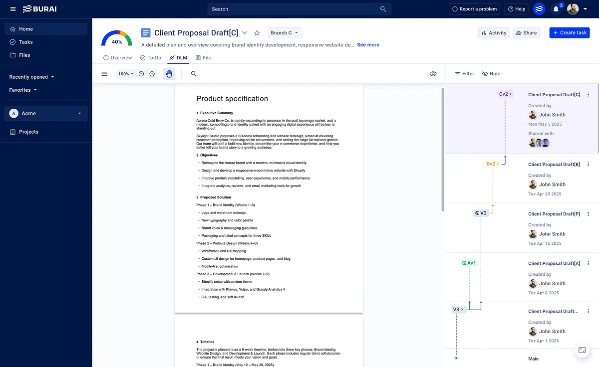 Burai Vault keeps every document version, update, and decision in sync. Branch, edit, and publish confidently while working in the tools you already use—and turn any document into actionable tasks without breaking flow.